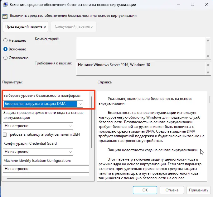 — В поле «Выбор уровня безопасности платформы» выберите «Безопасная загрузка» или «Безопасная загрузка и защита DMA» (если поддерживается оборудованием).