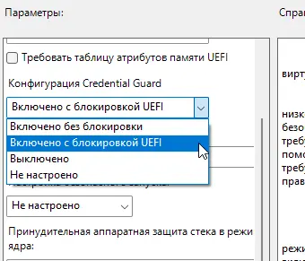 В том же окне настройте параметр Credential Guard Configuration: