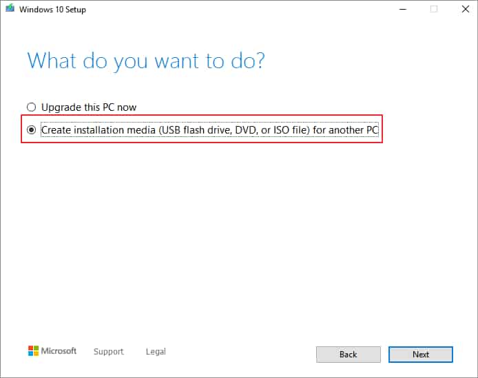 3. Choose the option «Create installation media (USB flash drive, DVD, or ISO file)» and click «Next».