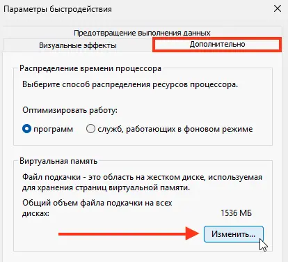 — Откройте «Панель управления» → «Система» → «Дополнительные параметры системы» → вкладка «Дополнительно» → «Параметры быстродействия» → «Дополнительно» → «Виртуальная память».