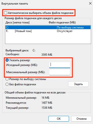 — Снимите галочку «Автоматически выбирать объём файла подкачки».