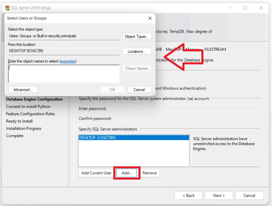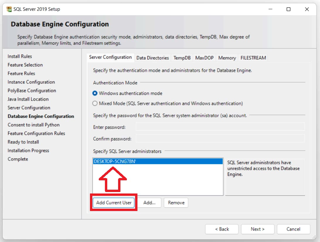 In the example, we will select «Windows Authentication Mode => click on the «Add current user» button and add it.
