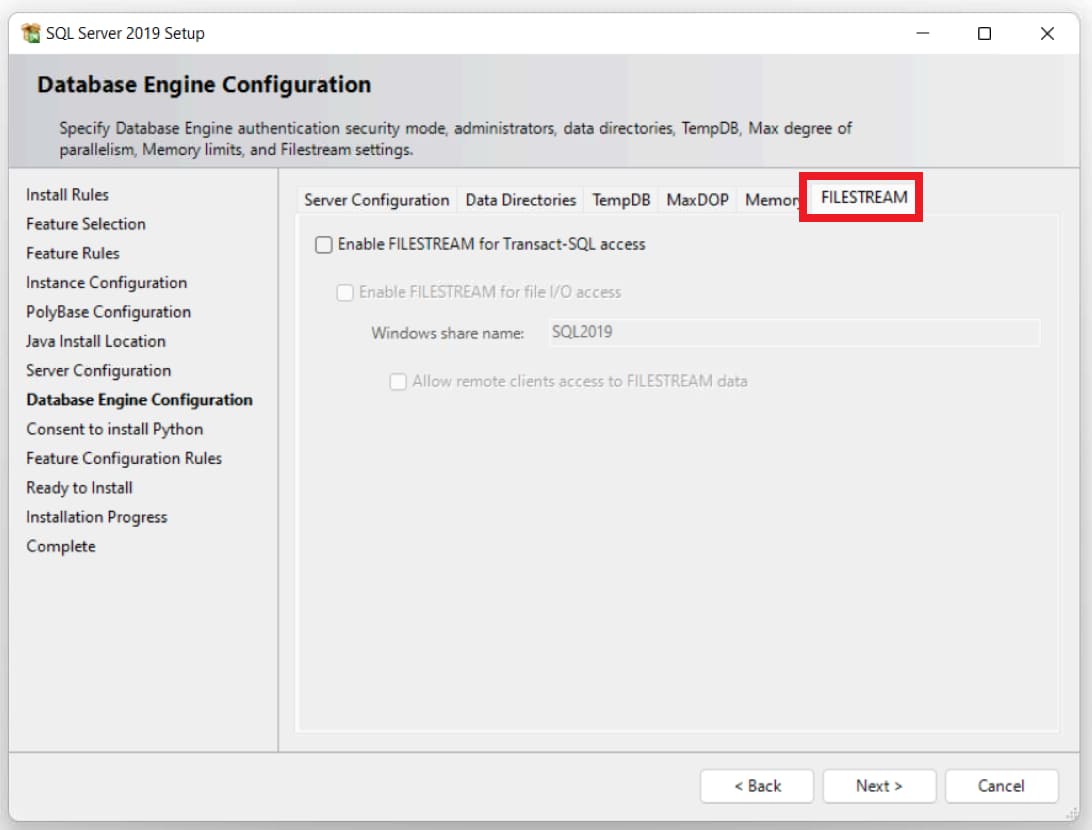 The next tab — Filestream settings — is a setting that allows you to store files in the NTFS file system, it can be activated or not, optionally.