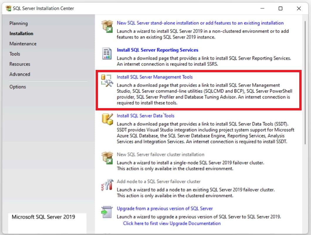Go back to the SQL Server installation center and click «Install SQL Server Management Tools».
