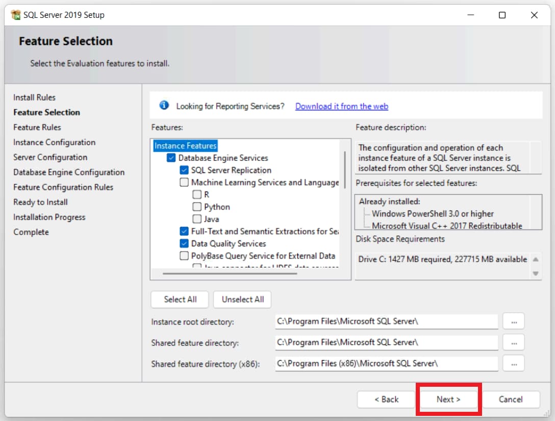 5) Next, you are asked to select the components to install in SQL Server, Attention! Choose the ones you need for your tasks, in the screenshot below — this is just an example, then click next.