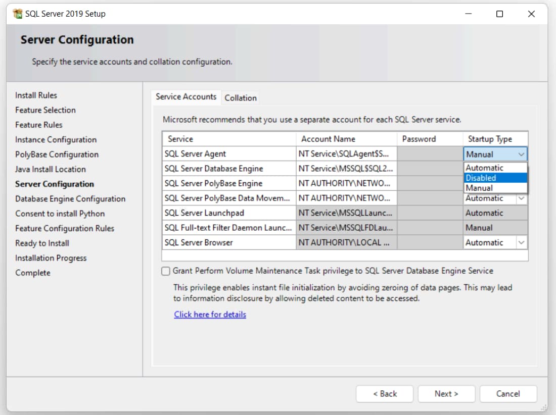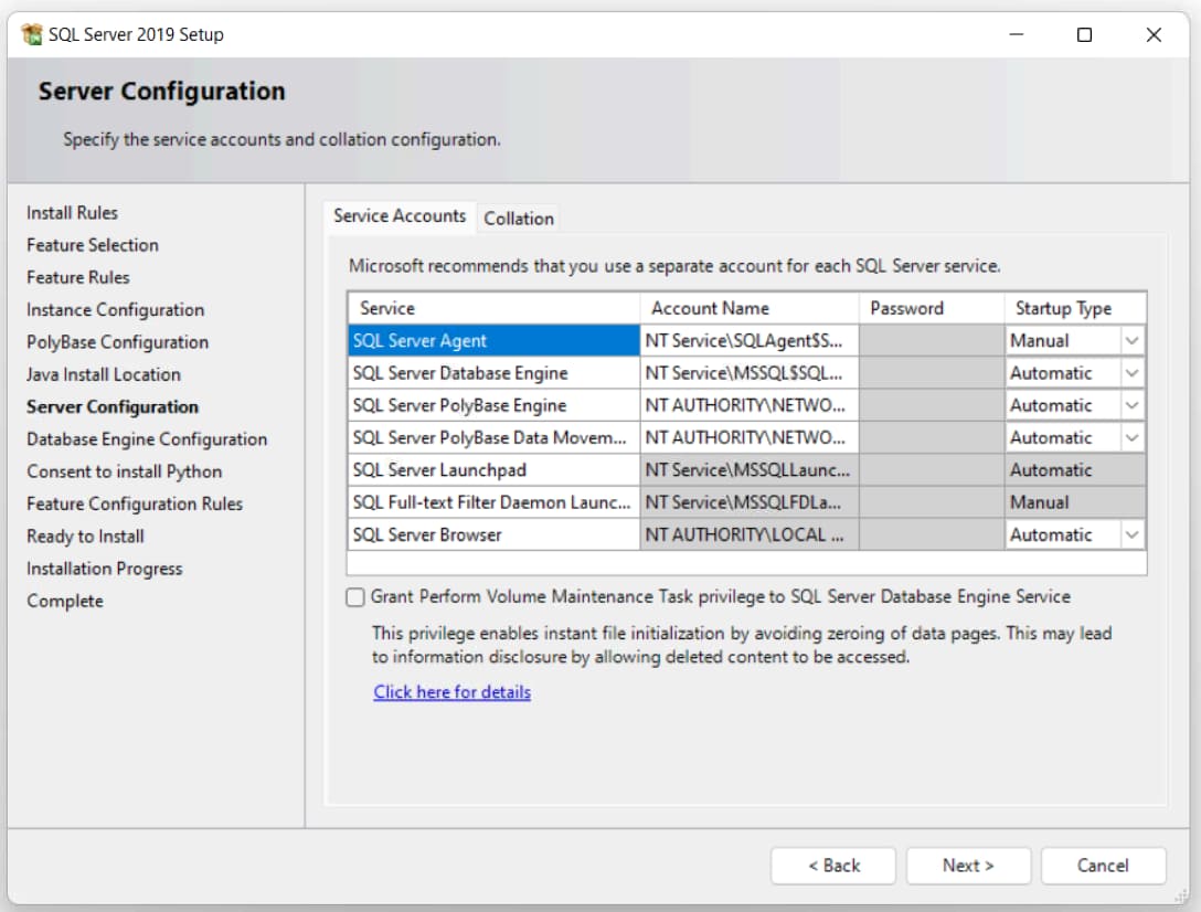 8) Next, go to the server configuration settings, pay attention to the «Account name» section — these are the accounts from which the SQL Server Agent, SQL Server Database, SQL Server Browser services will start. By default, your local account is used.