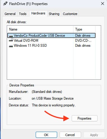 2. Go to the «Hardware» tab, select the desired device, and click the «Properties» button.