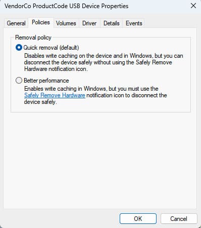 4. Go to the «Policies» tab. Depending on the type of drive, you will be prompted to choose between «Quick removal» and «Better performance». Select «Quick removal» and apply the settings.