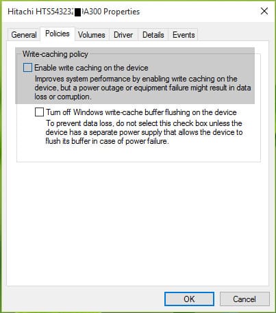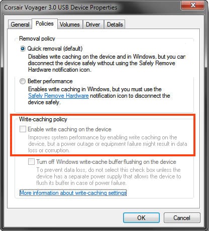6. For non-removable devices, only the options for changing write caching policies will be displayed — disable write caching if the problem occurred with a non-removable drive.