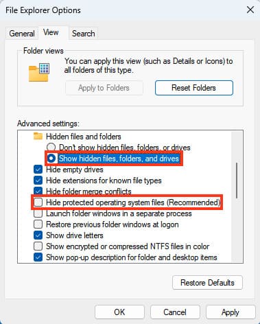1. Enable the display of hidden and system files. To do this, press Win+R, type control folders, and press Enter. Go to the «View» tab, uncheck «Hide protected operating system files», and check «Show hidden files, folders, and drives».