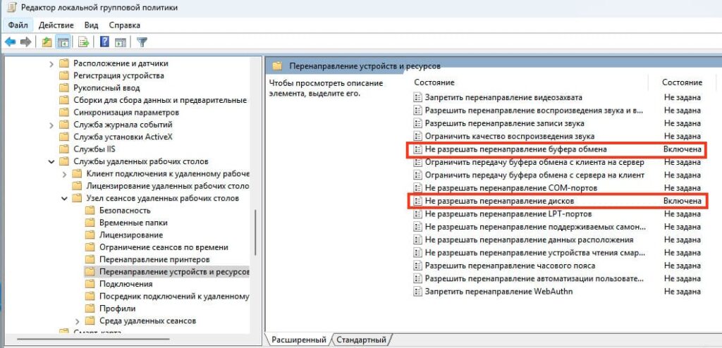 2) Перейдите в Конфигурация компьютера → Административные шаблоны → Компоненты Windows → Службы удалённых рабочих столов → Узел сеансов удалённых рабочих столов → Перенаправление устройств и ресурсов.