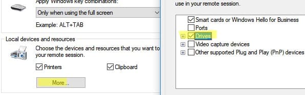 Параметр Drives позволяет использовать копирование файлов через буфер обмена (используются локальные диски в RDS сеансе).