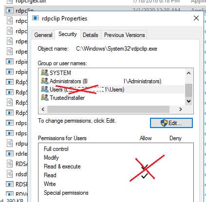 Если вы хотите запретить копировать из терминальной RDP сессии только для пользователей, но не для администраторов, можно изменить NTFS разрешения на файл c:\windows\system32\rdpclip.exe . Необходимо в свойствах файл убрать разрешение Read/Execute для встроенной группы Users (придется сначала изменить владельца файла с TrustedInstaller).