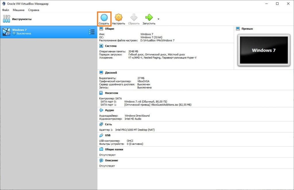 1. Откройте VirtualBox и нажмите кнопку «Создать».