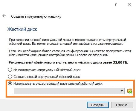3. На этапе выбора жесткого диска вместо опции «Создать новый виртуальный жесткий диск» выберите «Использовать существующий виртуальный жесткий диск» и укажите ранее созданный VHD файл.
