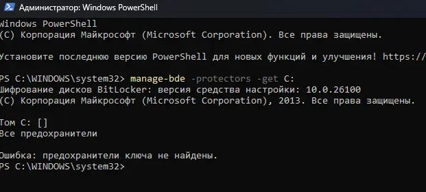 Для просмотра ключей уже зашифрованного диска используйте командную строку или PowerShell с правами администратора.