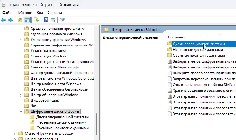 — Перейдите по пути: Конфигурация компьютера -> Административные шаблоны -> Компоненты Windows -> Шифрование диска BitLocker -> Диски операционной системы.