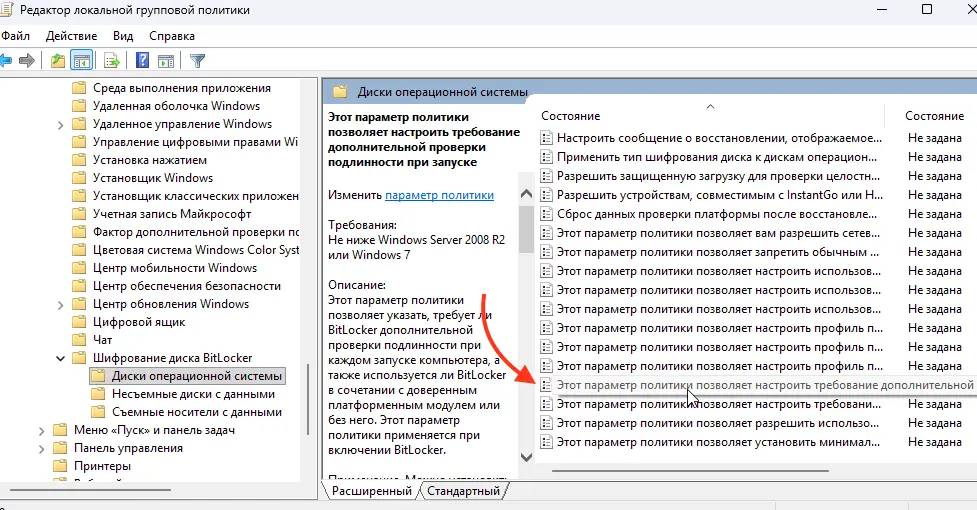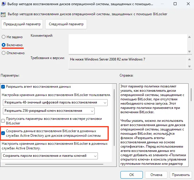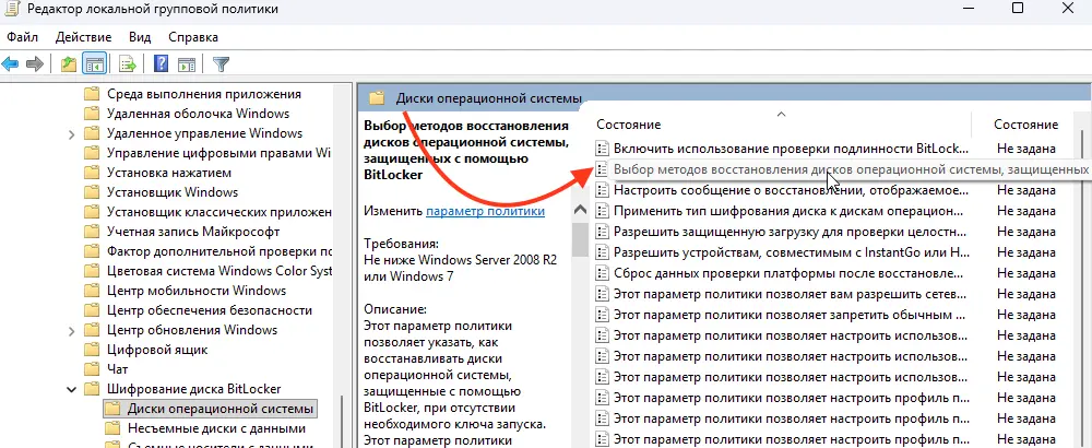 Это критически важный шаг для корпораций. Параметр называется «Выбор методов восстановления дисков операционной системы, защищенных с помощью BitLocker».
