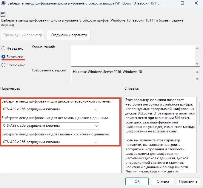 Новый режим шифрования (XTS-AES): Рекомендуется для устройств с Windows 10 и 11.