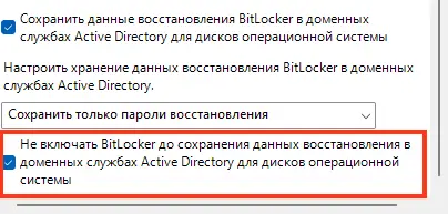 — Установите флажок «Не включать BitLocker, пока сведения о восстановлении не будут сохранены в AD DS для дисков операционной системы». Это гарантирует, что шифрование начнется только после успешного сохранения 48-значного ключа в домене.