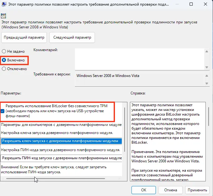 — Использовать ключ запуска на USB-накопителе (если TPM отсутствует или вы хотите дополнительную аутентификацию).