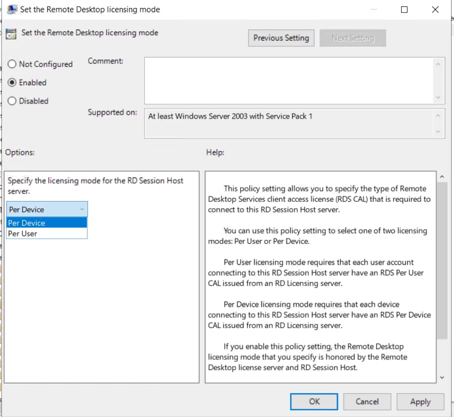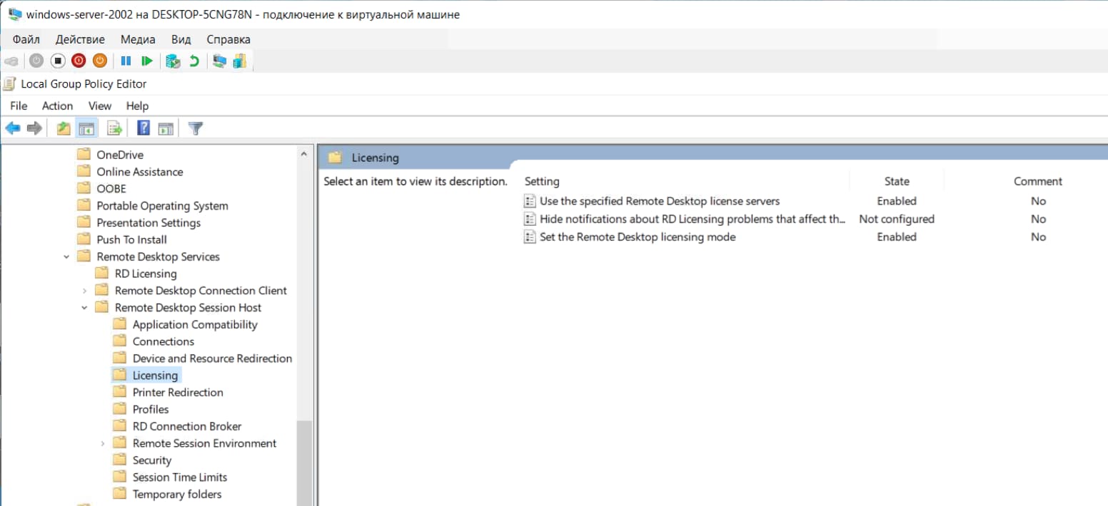 You can do this in the menu: «Search» on the toolbar => gpedit.msc => Computer Configuration => Administrative Templates => Windows Components => Remote Desktop Services => Remote Desktop Session Host => Licensing => Set the remote desktop licensing mode. In the drop-down menu, select «Per device», click «OK» and restart your server.