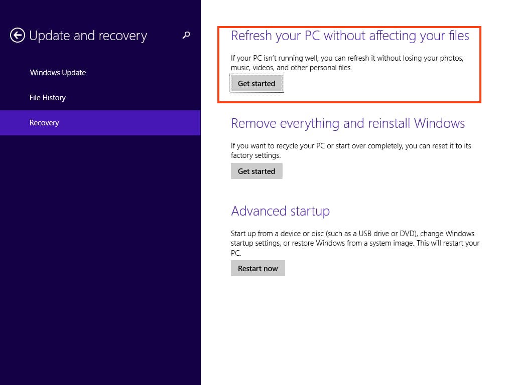 In the new window, select «Refresh your PC without affecting your files» and click «Get Started.»