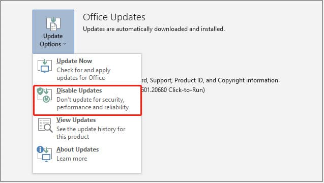 To rollback to a previous Office build (version), you must first disable automatic updates. In the Office application, select File > Account > Update Options and choose Disable Updates. If you do not do this, Office will automatically update to the latest version.