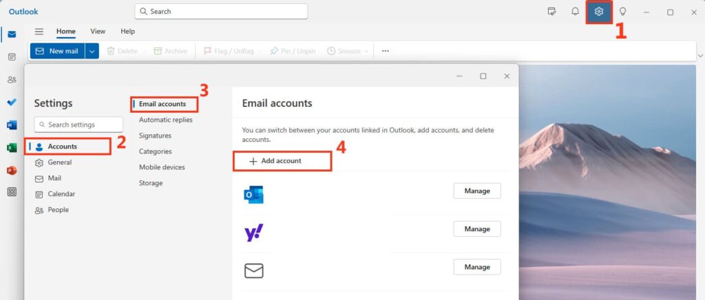 1) Open Outlook and Select Settings > Account > Email Accounts > Add Account.