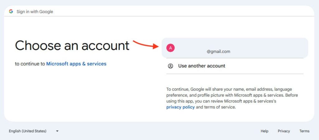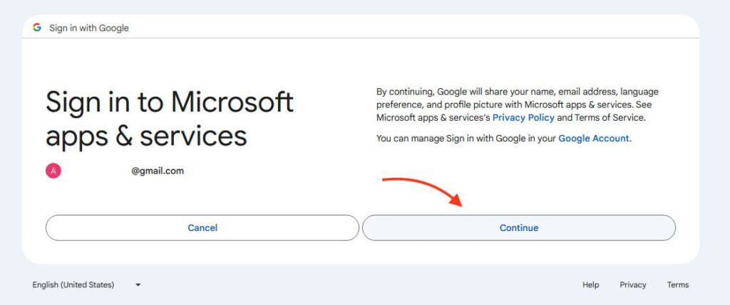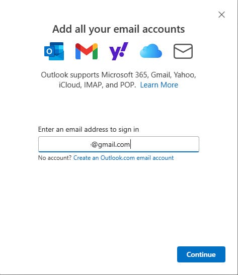 3) Outlook will launch the Gmail Sign-In window. Confirm the email you are adding and click Continue.