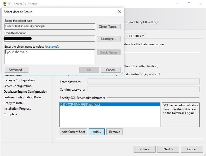 At this stage, it makes sense to click «Add Current User» to add the current user, and you can also add your domain account.