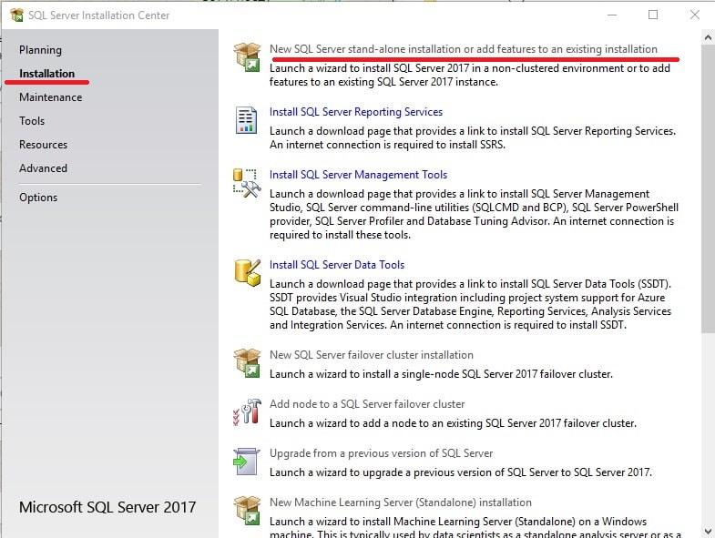 2) Open the installer and start the installation. In the menu on the left, click «Installation» => «New SQL Server stand-alone installation».