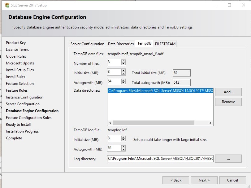 In the next tab, configure the TempDB settings. TempDB is a system database used for storing temporary objects.
