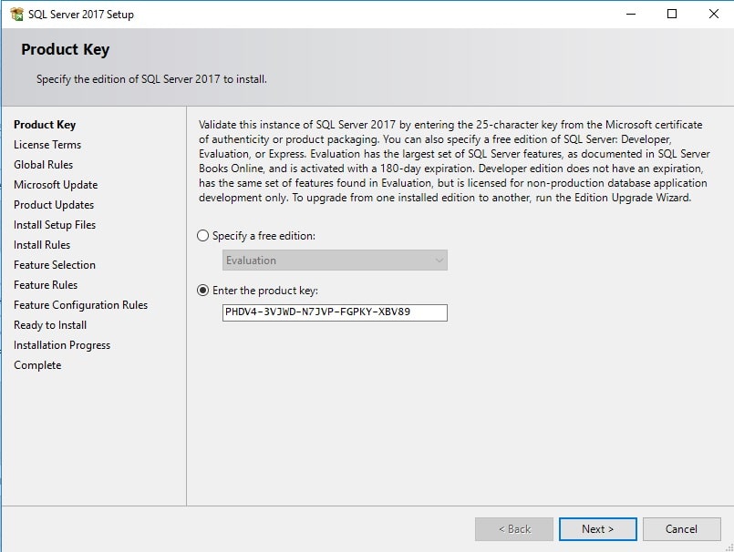 3) In the new window, you will be asked to choose a free version of the installation, such as «Evaluation». If you have a product key for SQL Server 2017 Standard or any other full-function key, enter it.