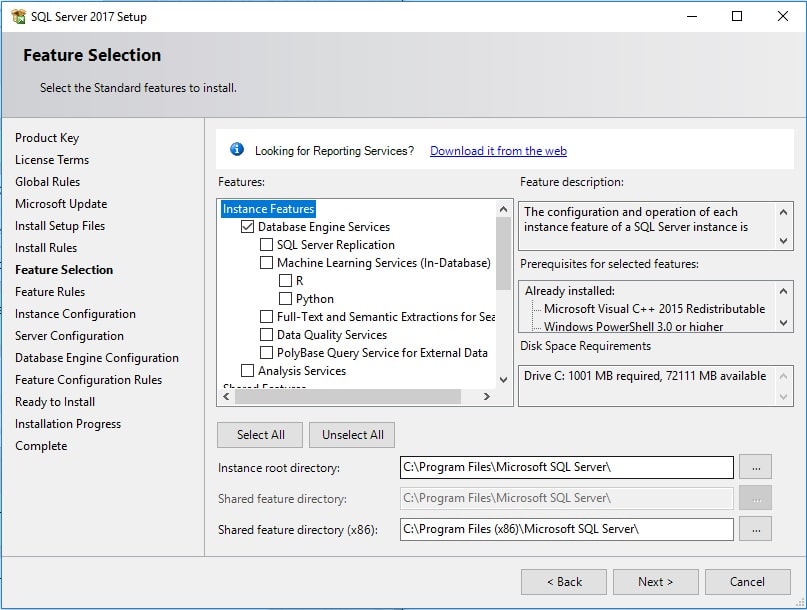 6) In the next window, you will be prompted to select the components of MS SQL Server you want to install. Choose the necessary components for your tasks and proceed.