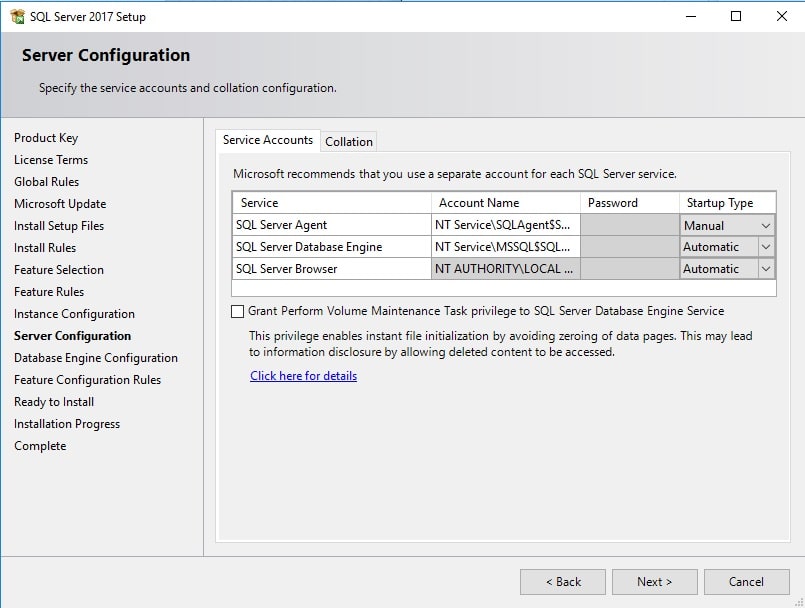 8) In the next window, you will be prompted to select service accounts. These are the accounts under which SQL Server Agent, SQL Server Database, and SQL Server Browser services will start. By default, personalized accounts are used.
