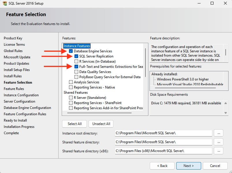 10) Select three checkboxes for «Database Engine Services», «SQL Server Replication», and «Full-Text and Semantic Extractions for Search». Then click «Next».