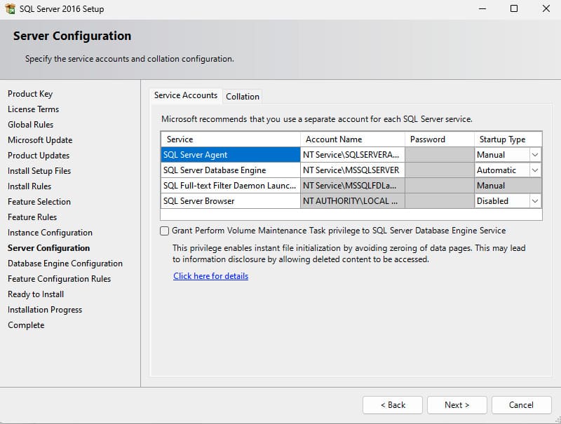 13) Proceed to the account settings for connecting to SQL Server 2016. You can choose to log in with Windows accounts or Mixed Mode, which allows logging in with both Windows and SQL Server accounts. If you choose Mixed Mode, you will be prompted to create an SQL Server account.