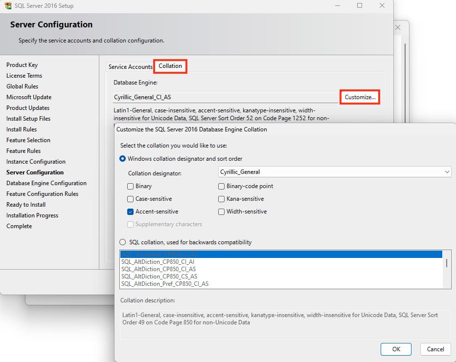 You can also go to the «Collation Settings» menu — these are encoding table settings, where you can define sorting behavior, such as case sensitivity and how to treat special characters.