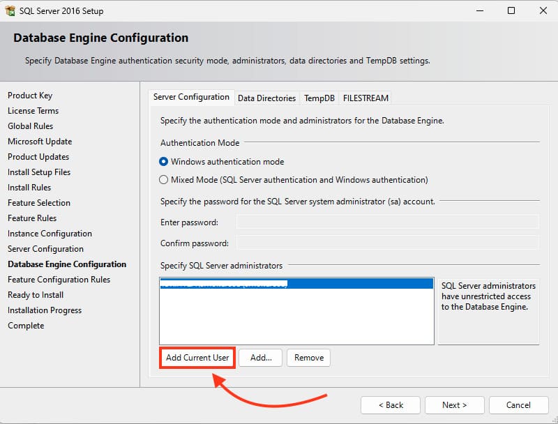 In the example, we select «Windows Authentication Mode,» then click «Add current user» to add it.
