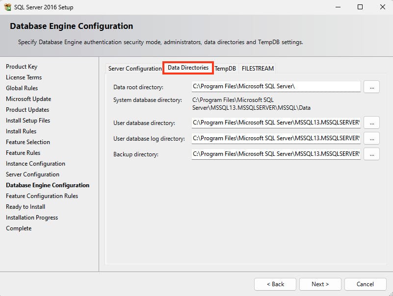 You can also go to the «Data Directories» tab. Here, you can choose locations for the root directory, system database directory, user database directory, user database log directory, and the backup directory. It is recommended to specify different locations on separate hard drives/partitions. Ideally, the data directory should be on a separate hard drive.
