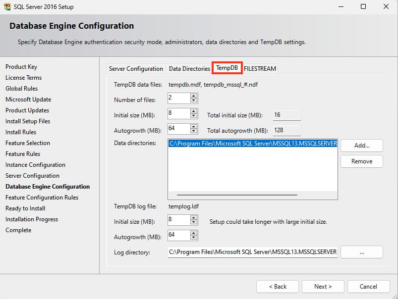 The next tab is «TempDB» settings.