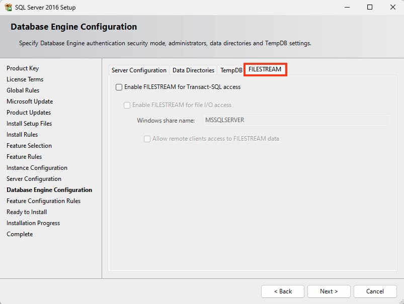 The next tab is Filestream settings — this is a setting that allows files to be stored in the NTFS file system. It can be enabled or disabled as an option.