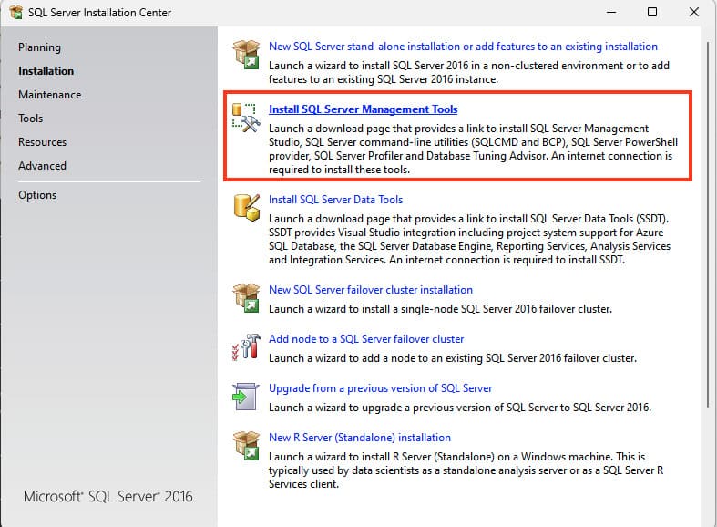 Go back to the SQL Server installation center and click «Install SQL Server Management Tools».