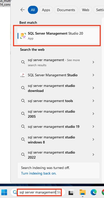 20) Use the Windows search to find the «Microsoft SQL Server Management Studio» application and open it.