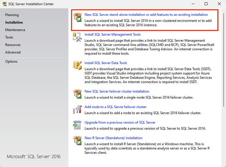 4) Then proceed to «New SQL Server stand-alone installation or add features to an existing installation»