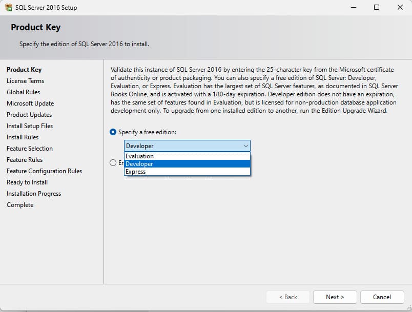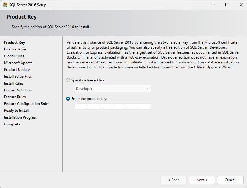 5) Next, select the free «Developer» edition and click «Next». Or, if you have already purchased a product key from our store, enter it in the «Enter the product key» section.