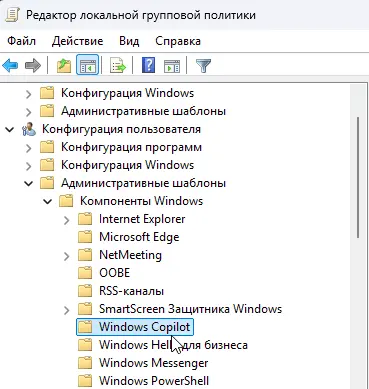 2. Перейдите по пути: Конфигурация пользователя > Административные шаблоны > Компоненты Windows > Windows Copilot.