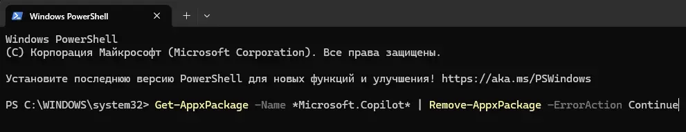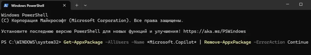 Предупреждение: Удаление через PowerShell может быть менее надежным в будущих версиях Windows, где Copilot интегрируется как системный компонент. Управление через GPO является предпочтительным методом.