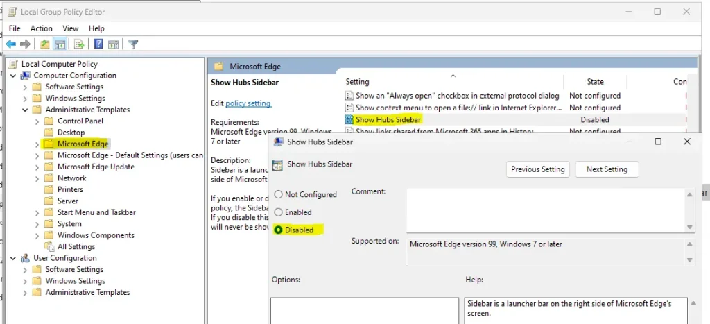 1. Откройте GPO и перейдите: Конфигурация компьютера > Административные шаблоны > Microsoft Edge > Sidebar (Боковая панель).